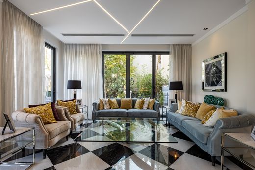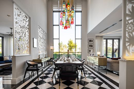 A majestic landscaped driveway with a central water feature guides you to the home. The formal living and dining area has been extended from its original layout, incorporating a relaxed family lounge and a bar area. The stylish closed family kitchen includes dark wood cabinetry, marble counters, integrated appliances, a breakfast counter, and underlit shelving. A family lounge is set in one corner of the home and the powder room has also been expanded.