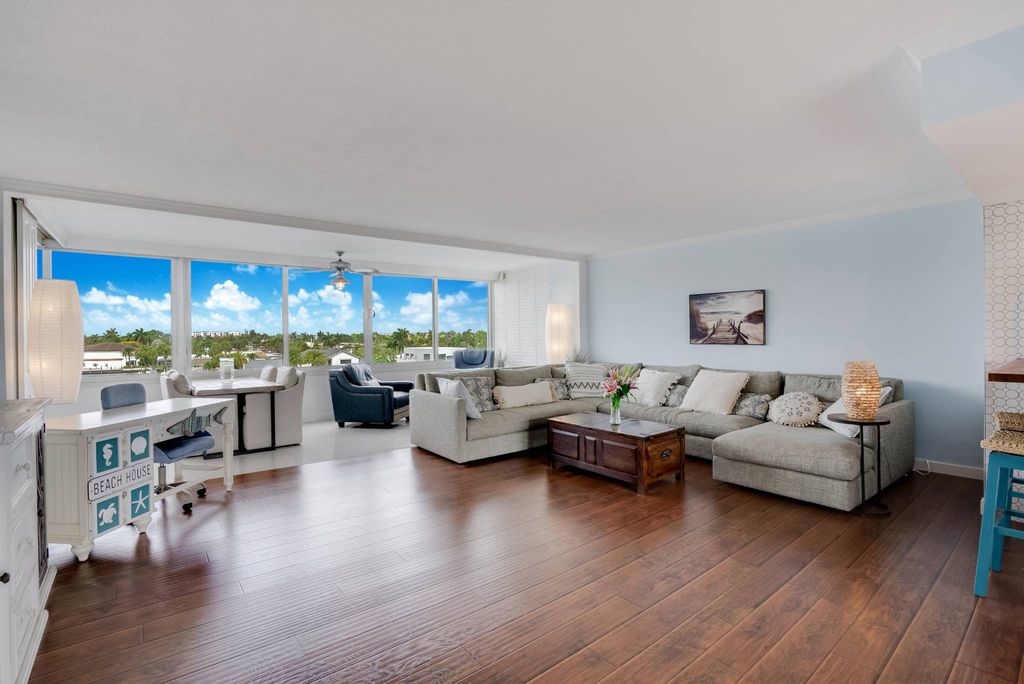 Waterfront Living at its "Best " on the Intracoastal Waterway. Move in ready with furnished as shown, with and stunning views. Watch the boats go by, experience effortless waterfront living. This condo has been made into a two-bedroom unit. All open and bright with hurricane doors and windows. Low maintenance fee. in this boutique building. Two blocks from the beach., restaurants, Jelly fish museum and much more. One underground parking space. Experience South Florida living at its best. Condo rider and seller disclosure attached