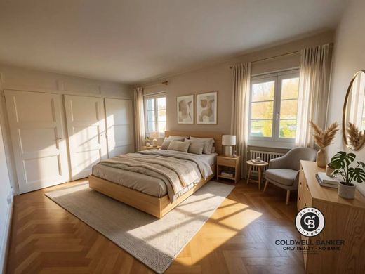 - Bedroom — 14.8 m², bright thanks to two large windows overlooking the Cery forest. Large wardrobe and original built-in closets. 3-meter ceiling height.