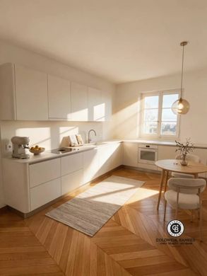 - Living/Dining Room — Southwest facing, solid wood parquet flooring, large windows, and an open-plan fitted kitchen. 3-meter ceiling height. View of Lake Geneva. Full of history and light.