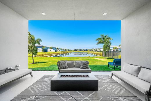 Annual Rental in Lotus Edge! This upgraded Polynesia model is set on an oversized west-facing lot with long lake views. This home has been customized beyond the builder's original design featuring 48x48 porcelain tile flooring, a striking glass staircase, smooth wall finishes, & fully upgraded trim work. A reimagined lighting plan enhances every space, with custom high hats, linear ceiling lighting, & over 50% more lighting than standard, creating a clean, modern ambiance. The expanded dining & kitchen dinette areas provide additional square feet space, while the kitchen is elevated w/ a unique stone backsplash, under-cabinet lighting, & refined ceiling details. The layout has been improved to maximize functionality, including reconfigured & expanded closets & converted storage space. All bathrooms have been fully upgraded with floating vanities, illuminated mirrors, frameless glass showers, custom finishes, & one-piece toilets. Designed for both comfort & technology, the home includes a Sonos sound system, built-in speakers throughout, security cameras, & a Daikin A/C system with UV filtration. All TVs included. Outdoor living is equally enhanced with 48x48 exterior tile, additional high-hat lighting, & an expanded yard, all overlooking tranquil premium lot with long lake views with ideal western exposure. Located in Lotus Edge, a nearly sold-out, lifestyle-driven community offers a complete luxury living experience. The 39,000 soft. clubhouse offers a resort style pools, lap pool, cold plunge pool, kids arcade and play zone, restaurant and bar, group studio training, indoor multi-sport complex, 24 hour fitness center, yoga garden, splash park, playground, tennis, pickleball, Padel and pro shop, card salon and so much more!