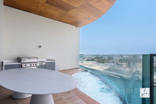 A private elevator opens into a double entrance vestibule, an elegant transitional space that separates the outside world from the home. From here, one enters the expansive living area, conceived as a continuous space where the double living room, dining area, and open-plan kitchen flow naturally into one another. The kitchen, fully equipped and finished to the same high standard as the main spaces, integrates seamlessly with the living area. From here, access is granted to the first terrace: a remarkable outdoor space featuring a lounge area, solarium, and private pool, offering a privileged view over the Dubai skyline. A separate service kitchen, with independent access, completes the living area and leads to the staff bedroom, which includes a windowed bathroom with shower.