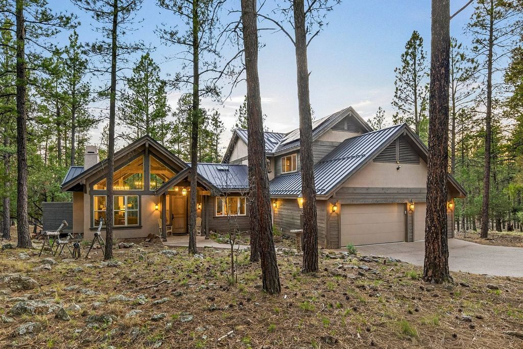 Set on 6.84 Ponderosa pine‑covered acres at the base of Mt. Elden, this Legacy property captures the very best of Flagstaff’s outdoor lifestyle: privacy, wildlife, and miles of premier mountain biking and hiking right outside your door. A custom home crafted with care and layered improvements welcomes you into a setting that feels both elevated and deeply peaceful. Inside, a grand living room showcases a custom Malapai rock fireplace and expansive view windows framing daily wildlife sightings, offering quiet moments among the pines. The entertainer’s kitchen features stain‑washed oak cabinetry, a walnut butcher‑block workstation, double ovens, and a dual‑fuel cooktop. The main‑level primary suite sits near an office or 5th bedroom, with three oversized ensuite bedrooms upstairs, including one with custom triple bunk beds. This home has undergone extensive high‑end interior renovations, including Knotty Alder doors and trim, designer lighting, premium wool Berber carpeting, a mix of slate and large wood plank wood floors, Hunter Douglas window coverings, upgraded stone and granite counters, and a spa‑inspired primary bath with a custom slate soaking tub. Recent major investments elevate long‑term reliability: owned solar, a premium metal roof, whole‑home air sealing by Cozy Home, a high‑efficiency heat pump system, and an upgraded 10,000‑gallon galvanized cistern. The property has been professionally fire‑wise treated, with over 150 additional trees and hazardous limbs removed. A mudroom and laundry area connect to the oversized 3‑car garage, and the home includes two heaters, a hot tub, two A/C units, a large shed, a central vacuum, and more. This turnkey mountain retreat blends luxury, durability, privacy, and an unmatched outdoor lifestyle, all on a paved county road in one of Flagstaff’s most coveted settings.