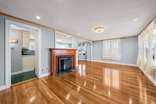 Ideally located between the Merrymount and Adams Shore neighborhoods, this recently expanded home offers a surprising amount of living space spanning across three levels, plus 672 sq ft of additional finished space in the lower level. Gleaming hardwood floors with dark wood inlay have just been refinished throughout, adding warmth and character on every level. The main level features a spacious kitchen, dining room, and living room with a wood burning fireplace, along with a first floor bedroom and adjacent full bath—ideal for guests or flexible living needs. The second floor offers three oversized bedrooms and another full bath. Capping this off, the top floor provides a versatile open flex space with direct access to a large walk out deck with views of Quincy Bay. The partially finished basement adds even more usable space with a living room, gas fireplace, and half bath. A detached two car garage and updated systems throughout make this home truly move in ready.