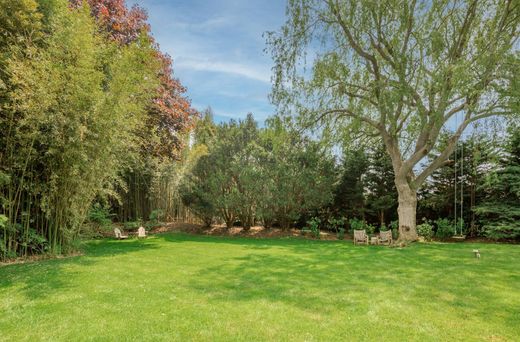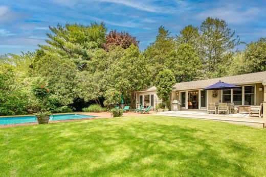 Tucked away down a long, private driveway is this spectacular cottage in Bridgehampton South. Conveniently located just behind the village, this one-story home has been recently renovated and refreshed with crisp new furniture. A cozy front porch and stunning cherry blossom tree welcome you, while interior highlights include an open concept living and dining room highlighted with a wood-burning fireplace and lovely reading nook illuminated with Venetian lanterns. A new backsplash adorns the separate kitchen that opens via a pass-way into the dining area. The primary bedroom has sliding glass doors and a newly renovated en-suite bath with beautiful tile and separate shower. Two additional guest rooms and another renovated bathroom complete the interior space of this finely decorated home. The backyard is tastefully landscaped and adorned with bamboo and tall specimen trees, including a spectacular weeping willow, to help ensure privacy. A large heated pool is flanked by a sunny patio and added decking for great entertaining, all with easy proximity to Bridgehampton shops, restaurants, transportation and ocean beaches. [[Rental Registration # RP220699]]