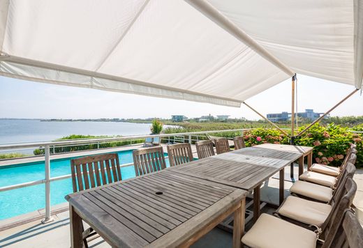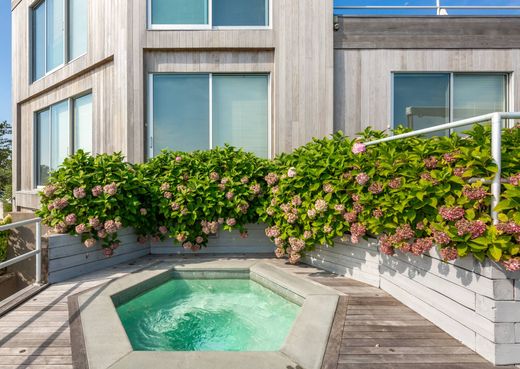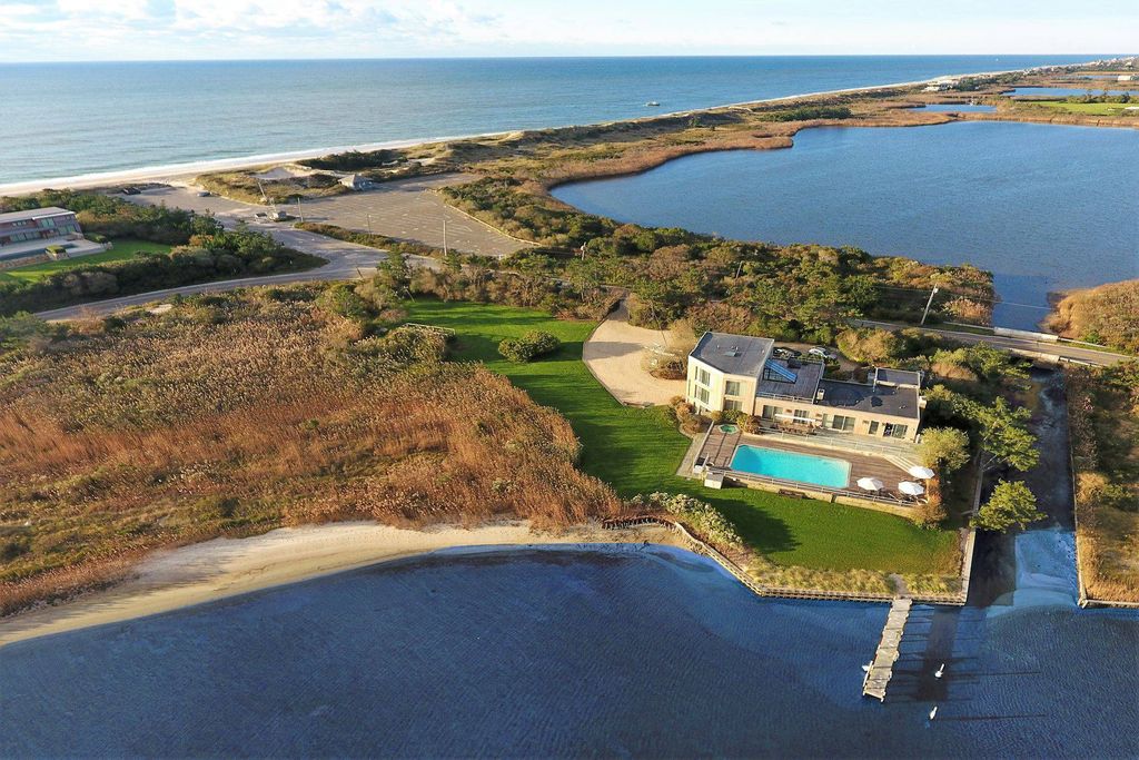 This perfect modern beach house on coveted Flying Point Road is available for the first time as a winter rental. With 360 degree water views it's light makes this house, one of a kind. The sun rises on Mecox Bay and sets on Channel Pond, and the house overlooks both as well as the Atlantic Ocean right across the street. There are a total of 5 bedrooms with both first floor and second floor primary bedrooms in addition to a sitting room, TV room, living room and open kitchen/dining room. Especially important this year is walk-out lower level gym with a Peleton, elliptical machine, treadmill as well as weights. There are 3 different outdoor decks on various levels and they face different locations for view/sun optimization. There is even an outdoor fireplace and hot tub. Very bright and furnished in easy haute beach style makes 1030 Flying Point, the ideal Fall, Winter, Spring rental. [[Rental Registration # RP240380]] EH RR #: RP240380
