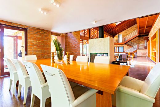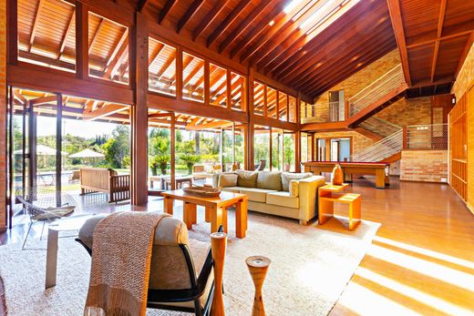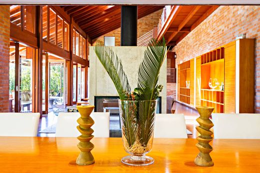This country house, located in front of a lake, offers exceptionally spacious interiors filled with natural light and extensive use of wood, creating a warm and welcoming atmosphere. The property features a swimming pool, a barbecue area, a dining room, a TV room, a fireplace lounge, and a home theater. The veranda overlooks the pool deck, framed by a beautifully landscaped garden. The house accommodates up to eighteen guests and provides a garage for six vehicles. The private wing includes five bedrooms: a primary suite and four American-style suites, each featuring double-height ceilings and mezzanines.