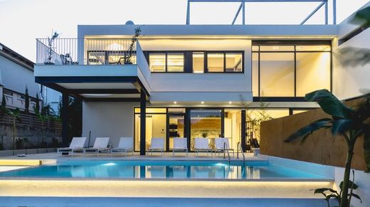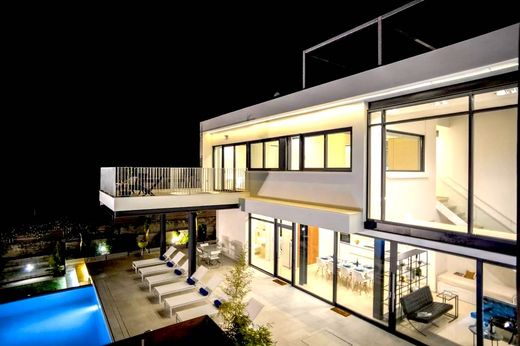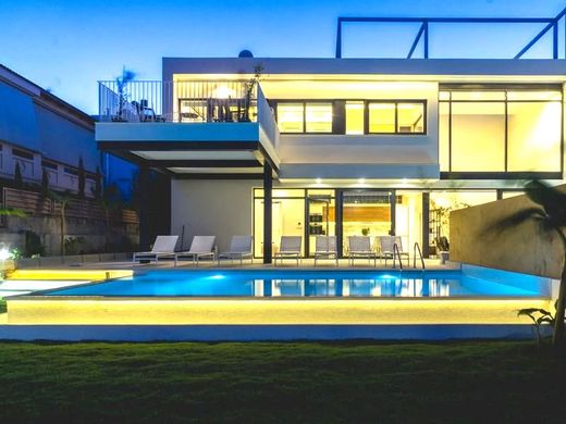 Dwie nowoczesne rezydencje w zabudowie bliźniaczej z trzema basenami, oferowane razem do użytku wakacyjnego. Przejrzystość i jednolitość powierzchni parteru uzyskano dzięki zastosowaniu dużych przesuwanych paneli przeszklonych i przestrzeni o podwójnej wysokości w części dziennej wschodniej rezydencji.