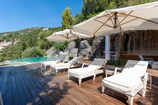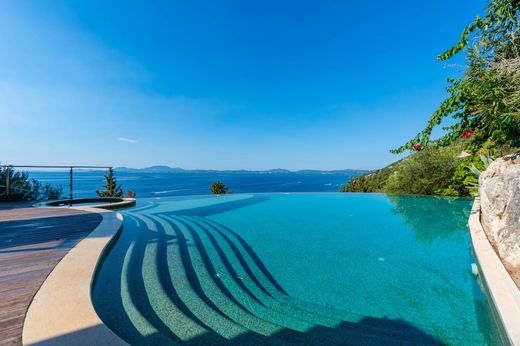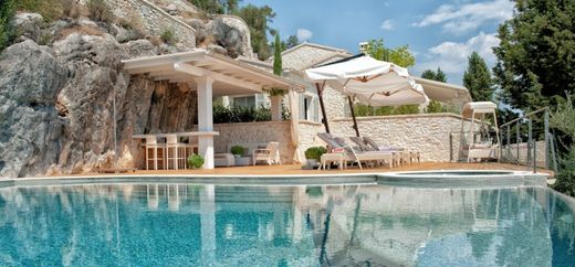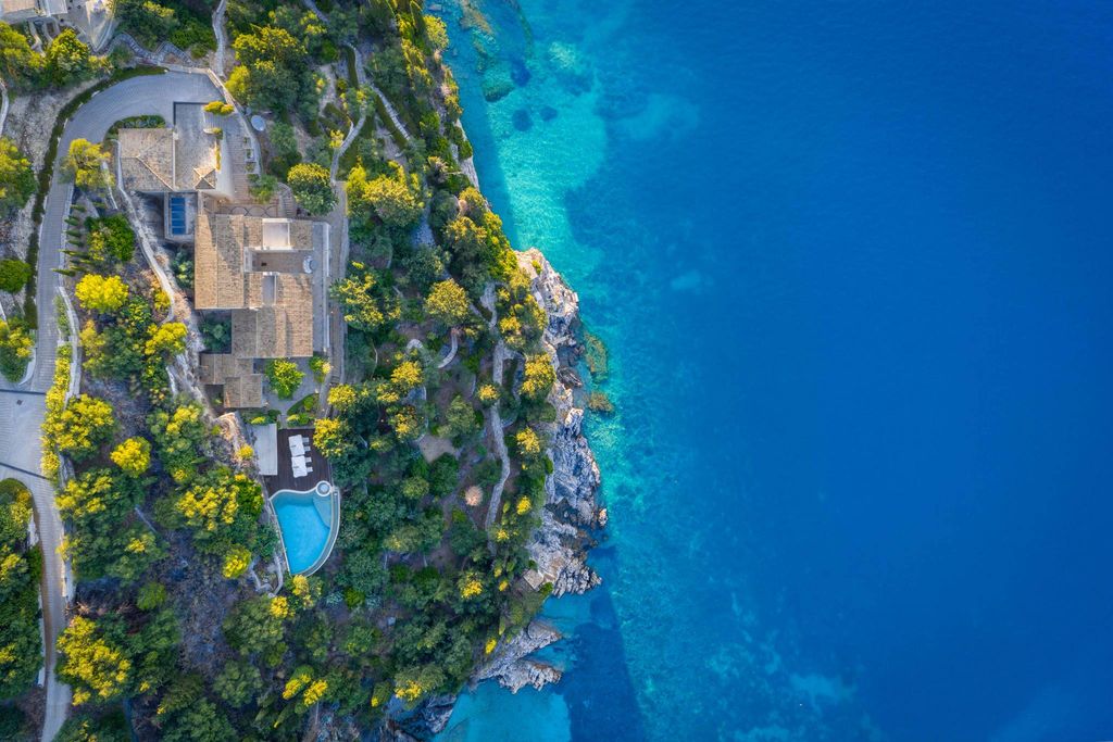 Wspaniała willa o powierzchni ok. 660 m2 Willa jest w rzeczywistości wbudowana w skałę na wysokości 25 m nad poziomem morza, nad jedną z najpiękniejszych zatok na Korfu. Willa ma przylegające dwupiętrowe studio dla służby, garaż na 2 samochody o powierzchni ok. 55 m2, dużą liczbę zadaszonych i otwartych tarasów (ponad 300 m2), basen typu infinity o powierzchni 100 m2 z jacuzzi w kształcie harfy i przylegający do klifu wyposażony w bar. Willa składa się z pięciu dużych sypialni i pięciu łazienek. Od parkingu i garażu do głównego wejścia prowadzą kamienne schody i nowoczesna winda. Ta kamienna willa jest położona na skale i szczyci się własnym prywatnym dostępem do morza z licznymi umeblowanymi wspaniałymi tarasami z widokiem na morze schodzącymi do wody. Jest to elegancka i duża nieruchomość o wyjątkowym pięknie z basenem typu infinity i pięknym tarasem z drewna tekowego, przestronnym zadaszonym barem i częścią wypoczynkową. Piękna nieruchomość zapewniająca spokój i wspaniałe widoki na morze.