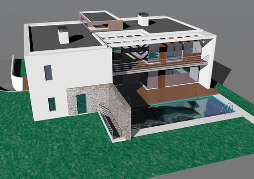 Descrição do Projeto: Moradia de rés-de-chão, 1º andar e cave, constituída por 7 suites, 3 wc´s, cozinha, sala de jantar, 2 salas de estar, home cinema, escritório, ginásio, jacuzzi, banho turco, sauna, piscina, tratamento de roupas, casa de máquinas e garagem.