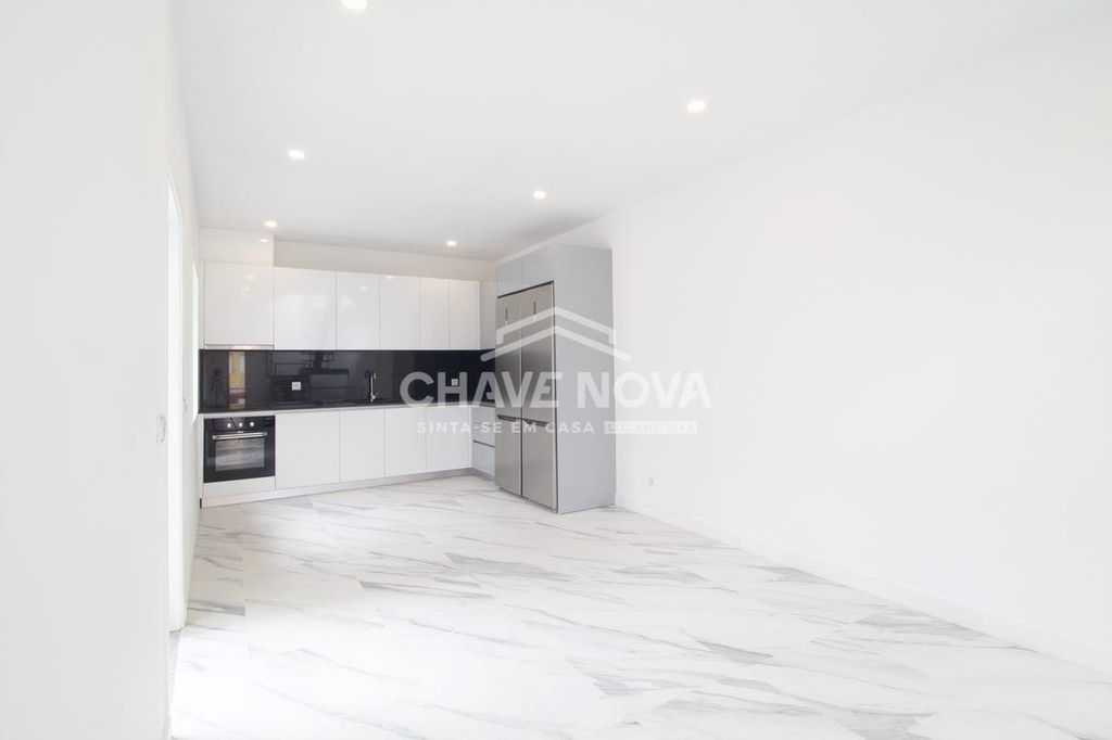 - 1º piso: sala com a cozinha em open space com acesso ao terraço/ logradouro com lavandaria; três quartos, um deles suite, com varanda, mais uma casa de banho completa de serviço. Cozinha equipada com placa, forno, exaustor, máquina de lavar louça, frigorífico;