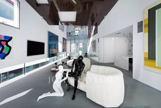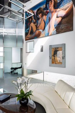 entre o mundo impessoal e dinâmico do exterior e o universo confortável e lúdico do interior. O gorgolejar da água indica-nos o caminho. À entrada, há um espaço de exposição. Uma sala continua a dupla altura de aço e vidro que esconde o acesso aos quartos.