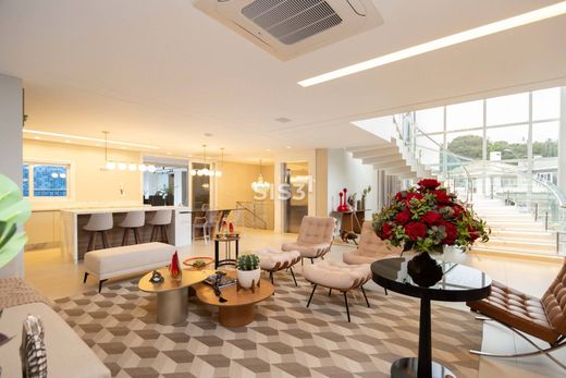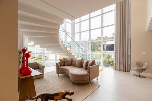 Logo na entrada, uma escada em mármore branco com iluminação embutida conduz ao pavimento superior sob o brilho de um lustre escultural, digno de cena de cinema. O pé-direito duplo valoriza a arquitetura e revela a imponência dos acabamentos. Para maior conforto, a casa conta também com elevador.