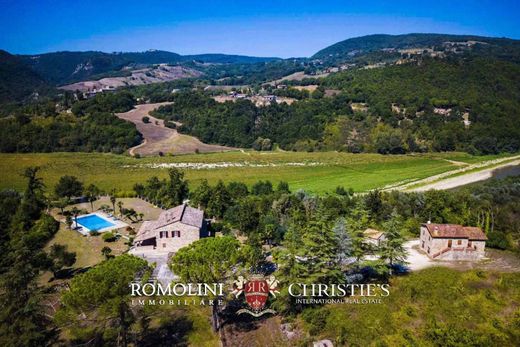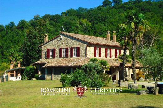 Impressionante propriedade rural com uma vila aninhada em 22 hectares de terreno: a propriedade se abre para uma paisagem extraordinária, situada em uma posição panorâmica espetacular no topo de uma colina suave, a 200 metros acima do nível do mar, com vista para o vale e o Rio Tibre abaixo. O edifício principal é uma vila magnífica e imponente, construída em pedra local clássica, iluminada e cheia de personalidade, com seis quartos e sete banheiros. O acesso à vila principal é feito por uma entrada fechada ladeada por esplêndidas palmeiras sinuosas (Trachycarpus fortunei), que conferem um toque exótico. No subsolo, um charmoso túnel de tijolos, longo e sinuoso, leva da vila principal às escadas que levam ao porão amplo e iluminado. Aqui, encontram-se uma adega impressionante, uma ampla área ideal para academia, área de bem-estar ou home theater, outro cômodo e um banheiro. No térreo, a entrada se abre para uma grande sala em forma de L com um imponente arco de tijolos que leva a uma sala de estar dupla com uma lareira impressionante. Pisos de terracota antigos, janelas duplas com molduras de ferro e portas francesas conferem um visual refinado. A espaçosa sala de jantar, com tetos com vigas expostas e pisos de terracota antigos, é inundada de luz graças a uma parede de janelas. A cozinha, acessível a partir da sala de jantar, apresenta pisos de terracota antigos, uma lareira com vigas expostas, um forno de pizza, um forno duplo e grandes bancadas de azulejos. Completando o piso, há um banheiro de hóspedes com chuveiro e um quarto de solteiro (ou escritório), bem como uma grande despensa/lavanderia com prateleiras. No primeiro andar, uma escada de terracota leva a um corredor que leva a cinco quartos de casal muito espaçosos e iluminados, um com lareira e quatro com banheiros privativos (dois com chuveiros, um com banheira e chuveiro, e um com banheira, chuveiro e pia dupla). Um banheiro separado atende ao quinto quarto. Os pisos são de terracota moderna. Uma magnífica varanda panorâmica de 150 metros quadrados oferece um espaço extraordinário para acomodar vários convidados, com vista para todo o jardim. Perto da cozinha, há uma área com churrasqueira e um grande forno de pizza. Ao lado da vila, há uma garagem de pedra para dois carros, com um depósito adjacente. Anexado à garagem, há um prédio de dois andares que precisa de restauração, com possibilidade de construção de um andar adicional. EXTERIOR Um maravilhoso jardim maduro de 2 hectares circunda a vila, com arbustos floridos, árvores e flores aninhadas entre altas palmeiras-moinho-de-vento (Trachycarpus fortunei). A piscina retangular de mosaico de 16 x 8 m está localizada no centro do jardim, a poucos passos da vila. A propriedade já conta com as fundações para uma quadra de tênis. Os 20 hectares restantes de terreno incluem bosques (14 ha) e terras agrícolas/aráveis (6 ha). O abastecimento de água da propriedade é feito por um poço privativo e independente, garantindo água gratuita e ilimitada. CIDADES PRÓXIMAS Todi 11 km (10'), Civitella del Lago 16 km (20'), Baschi 18 km (20'), Orvieto 28 km (20'), Amelia 36 km (50'), Montefalco 40 km (40'), Bolsena 42 km (45'), Foligno 46 km (55'), Perugia 50 km (40'), Terni 53 km (40'), Spoleto 55 km (1h), Narni 56 km (45'), Assis 66 km (50'), Spello 69 km (45'), Roma 136 km (1h 30'), Florença 190 km (1h 40'). AEROPORTOS PRÓXIMOS Perugia San Francesco 52 km (35'), Roma Ciampino 150 km (1h 30'), Roma Fiumicino 165 km (1h 35'), Ancona Falconara 158 km (2h), Florença Vespucci 199 km (2h 5'), Pisa Galilei 260 km (2h 50'), Bologna Marconi 281 km (3h).