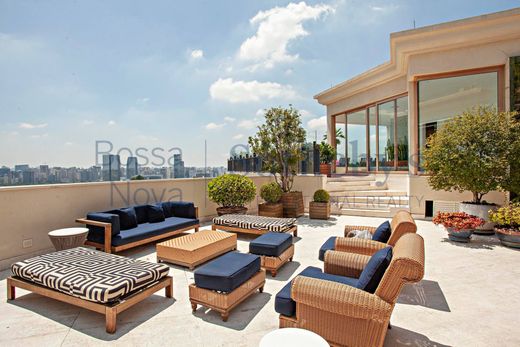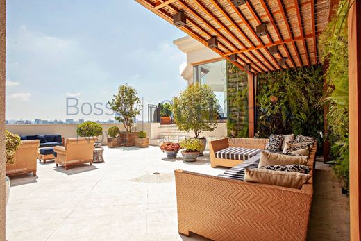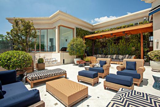 Полностью меблированный и декорированный двухуровневый пентхаус в отличном месте Сан-Паулу, с видом на парк. На первом этаже находится гостиная с мраморным полом, отличным освещением и звуковой системой, а также семейная комната, медиа-зал, офисное помещение, столовая, полностью оборудованная кухня и четыре спальни. имеют отдельные ванные комнаты, много встроенных шкафов и кондиционер. В главной спальне есть гардеробная и ванная комната для него и для нее. На втором этаже находится еще одна жилая зона, а также зона для гурманов, столовая и помещения для отдыха, включающие паровую баню с двумя ванными комнатами, гидромассажную ванну, бассейн с подогревом, гриль для барбекю, печь для пиццы и винный холодильник. Во всех номерах есть кондиционер. Здание предлагает 10 парковочных мест в гараже и круглосуточную охрану.
