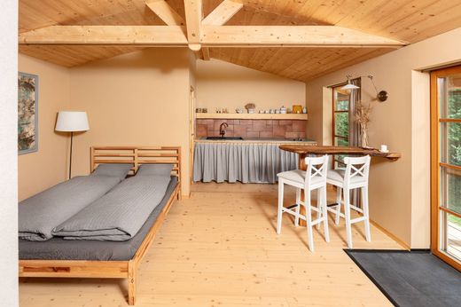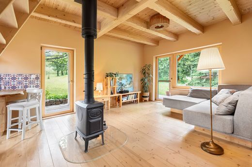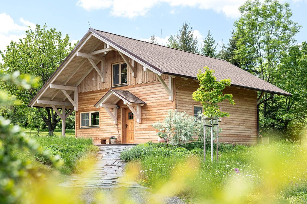 Стильный дом был достроен в 2022 году. Внутри полы из массива ели, обработанные белым маслом, чугунная печь Jotul и стильная мебель включены в стоимость. Тепловой комфорт обеспечивают тёплые полы на первом этаже и электрические инфракрасные панели на чердаке. Деревянные евроокна с тройным остеклением, в интерьере использованы двери и наличники из массива ясеня, а также часть мебели. Кухня оборудована бытовой техникой Electrolux и Gorenje, включая стиральную машину AEG. Фасад дома выполнен из сибирской лиственницы, которая также встречается на наклонной части террасы. Крыша покрыта прочной черепицей IKO Cambridge Xtreme. Полезная площадь дома составляет 141 кв. м, гараж – 27 кв. м, застроенная площадь – 170 кв. м. Площадь сада составляет 5009 кв. м, общая площадь участка – 5179 кв. м. Участок зарегистрирован как участок под застройку и, помимо уже существующей застройки, может быть использован для дальнейшего строительства в будущем. В саду построен полностью оборудованный гостевой домик с мини-кухней и ванной комнатой. Также имеются крытое парковочное место с запираемым складом, пробуренная скважина (глубиной 25 м) и трёхкамерный септик с грунтовым фильтром.