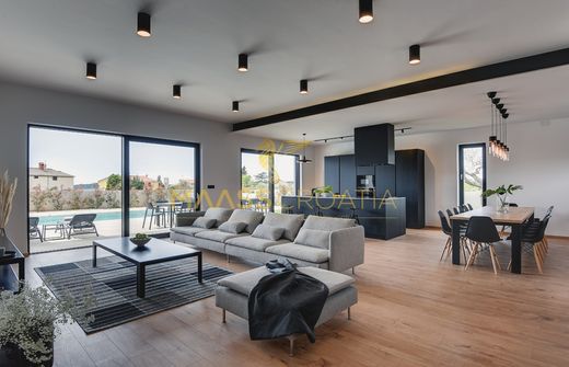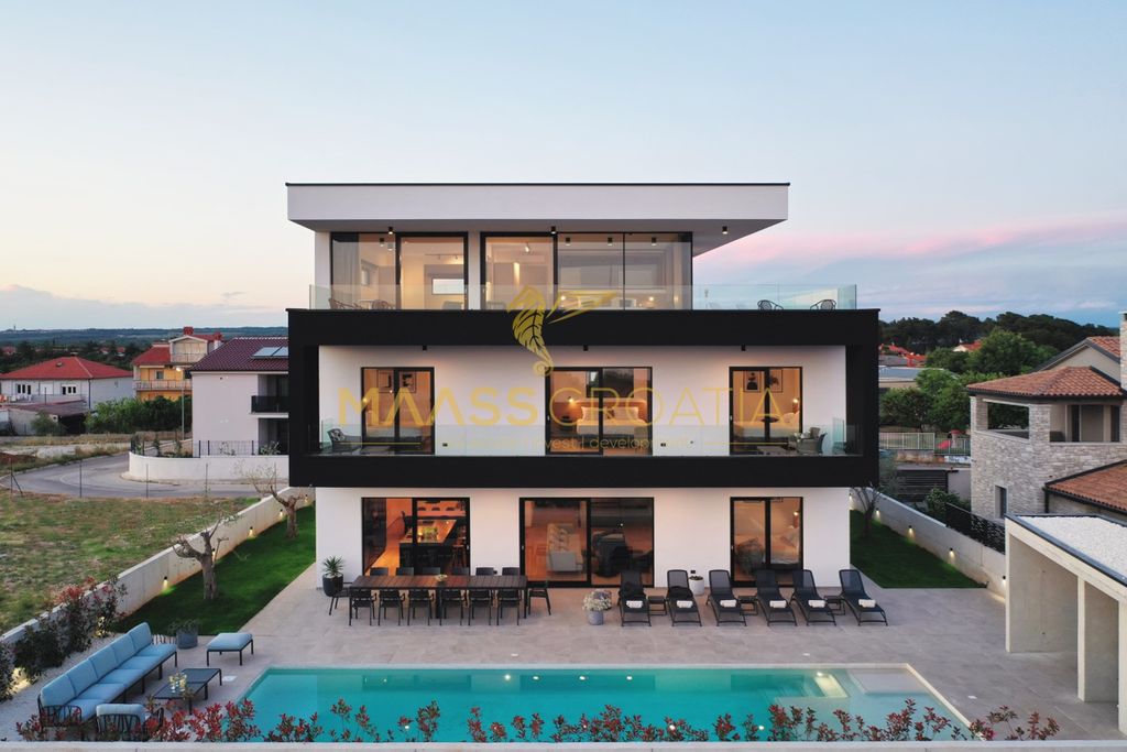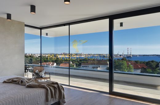 Эта красивая трехэтажная вилла, построенная по последнему слову техники, с жилой площадью 400 м2 и земельным участком 700 м2 расположена недалеко от побережья и всего в 1 км от центра Пулы.