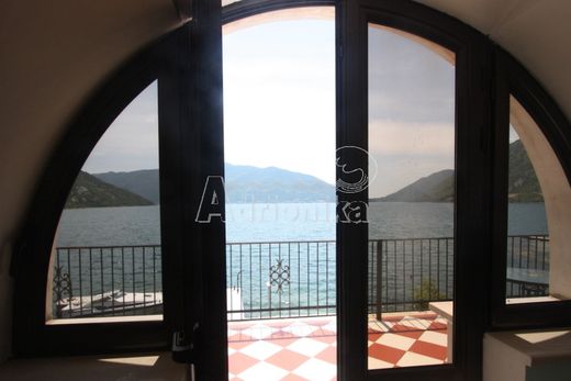 Трехэтажная вилла, находящаяся прямо на берегу Адриатического моря с пляжем и причалом. Из окна открывается захватывающая панорама на бухту и острова. Вилла расположена в г. Рисан - одном из старейших городов Черногории, в 30 минутах езды от аэропорта Тиват. Вилла построена в 2000 году по индивидуальному проекту известного архитектора Й. Йовановича. Площадь виллы – 400 м2 . Фасад и внутренняя отделка - натуральный камень и мрамор. На первом этаже расположены: каминный зал, барная стойка, кухня, столовая, библиотека, туалет. На втором: 3 спальни, кухня-столовая, ванная и туалет, 2 террасы. На третьем: два отдельных апартамента (по 35 м2) + большая терраса. Дом полностью меблирован, бытовая техника, кондиционеры, спутниковое телевидение, 2 телефонные линии, автономное водоснабжение, поэтажное отопление. Во дворе расположена уютная летняя терраса с мини кухней и каменным грилем, газоном и садом. Рядом отдельный, двухэтажный, каменный дом , 80 м2, построенный в 1998 году,с собственным двором и гаражом. Цена по запросу