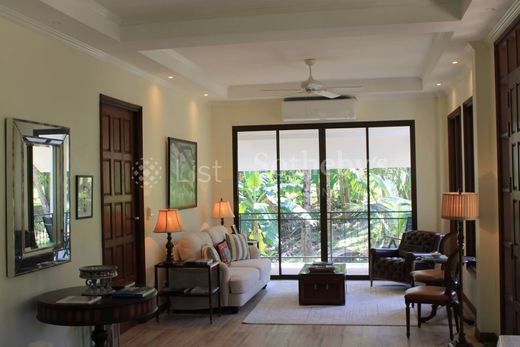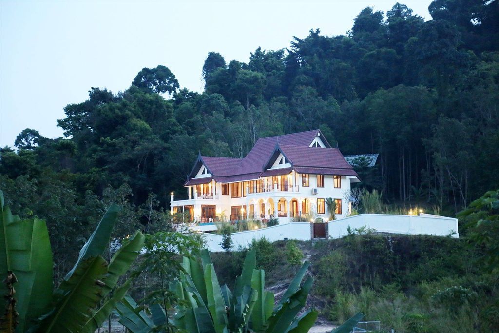 这座庄严的住宅坐落在一个寂静的山谷深处,与外界隔绝。住宅高高地坐落在海角上,背靠群山和国家公园,面朝东面和东北面,可以欣赏到泰国湾的宁静景色。在近处的寂静海湾外,是远处的山脊和更远的大海。主屋是一栋 5 间卧室、4 个半浴室、700 平方米的家庭住宅,坐落在 7 莱(3 英亩)的 Chanote Title 土地上。独立的 3 间卧室客用小屋和独立的员工宿舍,像哨兵一样守卫着通往主住宅的蜿蜒 200 米车道。住宅设计时考虑到了宜居性,拥有五间宽敞的卧室,配有宽敞的浴室和步入式衣橱。楼下的卧室套房位于房屋后部,为客人提供私人避难所。明亮开放的厨房有一个非常大的座位岛,可容纳六到八人,还有一个单独的正式餐厅,双面板门可轻松容纳十四人。书房里摆满了书架,为互动或安静阅读提供了一个优雅而轻松的场所,而更正式的客厅则通过玻璃面板双门进入。宽阔的中央楼梯将您带到一个巨大的二楼客厅,四周环绕着另外四间卧室套房和两个阳台。整个房子都有超大的窗户,带来充足的自然光,以及广阔的大海和丛林景观。房子的前面有一个带拱形柱子的门廊和覆盖着天然砂岩的泳池甲板,环绕着一个十二米长的错层游泳池。周围丛林的美丽与专业设计的花园融为一体,花园里有果园、橡胶树林、广阔的草坪、高耸的岩层、一个有几十种观赏树的花园,以及一个非常高产的有机菜园。材料的选择考虑到了美观和耐用性。所有窗户均由清迈的木匠大师用实心桃花心木制成。整个房子都铺有实心硬木榫槽地板,让人感觉仿佛身处活生生的丛林。庭院给人一种公园般的感觉,随着时间的流逝,一百多棵观赏树和几十种外来植物将逐渐成熟,庭院将更加美丽。这座真正罕见而珍贵的家族庄园是岛上首座此类庄园,在这里,幸运的少数人将不会遇到太多生活中的干扰和干扰