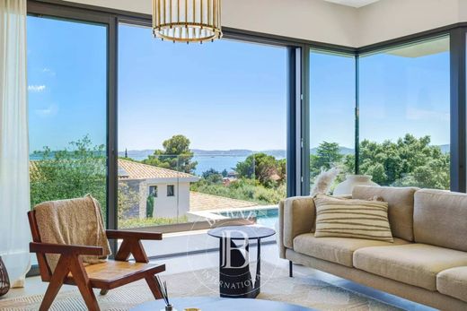 楼上:休息室、餐厅和厨房,通向带无边泳池的露台。