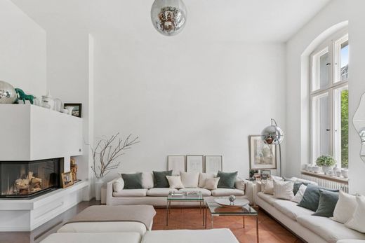 柏林西城的时尚生活——古典建筑与精致现代设计的碰撞 这套精美的复古公寓坐落于一条宁静的小巷中,距离维滕贝格广场和标志性的卡迪威百货仅几步之遥,占据了一座古典修复建筑的整个二楼(贝莱塔奇)。公寓于 2015 年进行了全面翻新,拥有约 205 平方米的居住空间,室内细节考究,将历史特色与现代品质完美融合,坐落于柏林最令人向往的地段之一。该建筑本身仅包含四个住宅单元,营造出宁静祥和、精心维护的氛围和高度私密性。由于每层仅设一套公寓,这套住宅享有独特的地理位置,同一楼层没有其他邻居。五间宽敞的房间——包括一间光线充足的工作室、一间装饰灰泥的雅致会客室以及一个带壁炉的宽敞起居区——为精致的都市生活提供了充足的空间。住宅布局经过精心规划,用途多样,无论是作为时尚的家庭住宅,还是精致的城市度假胜地,均可轻松入住。高品质的 Brunner 玻璃壁炉为主起居区增添了温暖和氛围,凸显了住宅的舒适感和设计的完整性。卧室位置安静,面朝绿树成荫的内部庭院,内设一体式衣帽间——一个宁静而均衡的私人空间,设计低调优雅。Neuhaus 定制设计的不锈钢厨房专为烹饪乐趣而设计:配备 SMEG 六头燃气灶和铁板烧烤炉、两个烤箱、带制冰机的 SMEG 对开门冰箱、Miele 洗碗机以及 O+F Design 设计的等离子抽油烟机。步入式餐具室、滑动玻璃门以及厨房窗台上迷人的香草园使整体效果更加完美。原有的木地板、新铺设的人字形拼花地板和修复的镶板地板为房间营造出温暖经典的氛围。双开门,约。四米挑高天花板,饰以华丽的灰泥,双层玻璃推拉窗,以及法国手工制作的 Meljac 开关和插座,巧妙地融合了传统与现代风格。雅致的浴室配备卡德维 (Kaldewei) 浴缸、铺有超大天然无缝石材瓷砖的步入式淋浴间、汉斯格雅雅生 (Hansgrohe Axor) 卫浴配件、不锈钢加热毛巾架和地暖。独立的客用卫生间和精心设计的集成式生活区,配备美诺 (Miele) 洗衣机和烘干机,进一步提升了室内舒适度。此外,公寓还配备两个阳台、一个私人地下室、一个实用的储藏室、一台由通力 (KONE) 全新安装的现代化电梯以及两个独立入口。这套住宅重新诠释了柏林经典住宅的传统——宽敞、精致,在市中心静谧地独享。